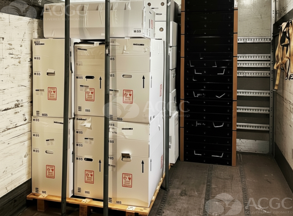 The shipment consisted of 20 racks, each measuring 48 × 66 × 102 inches and weighing 4,480 lbs. Due to the value and sensitivity of the cargo, the project required enhanced security measures and strict operational control throughout the entire journey.
